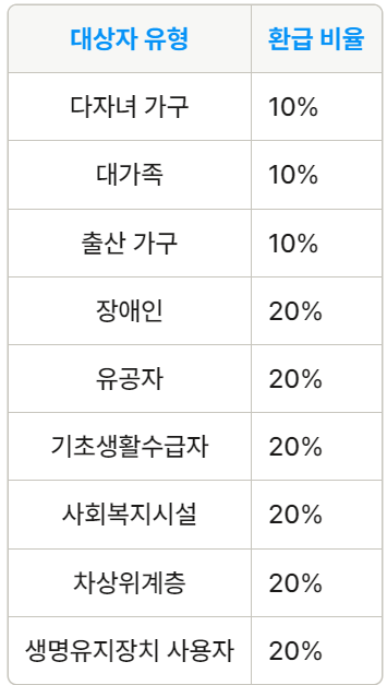 환급 혜택은 여러 유형의 가구와 개인에게 제공됩니다. 대표적인 대상자 유형과 환급 비율은 다음과 같습니다.