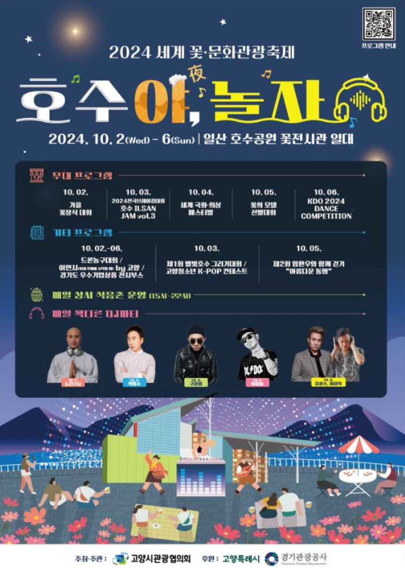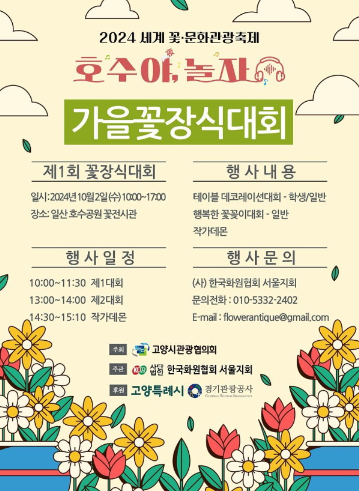 고양시에서 열리는 세계 꽃 문화관광축제 '호수야 놀자'는 꽃축제와 K-컬처를 결합한 특별한 행사입니다! 2024년 10월 2일부터 6일까지 일산호수공원에서 다양한 프로그램이 마련되어 있으니, 가족과 친구들과 함께 즐거운 시간을 보내보세요.
