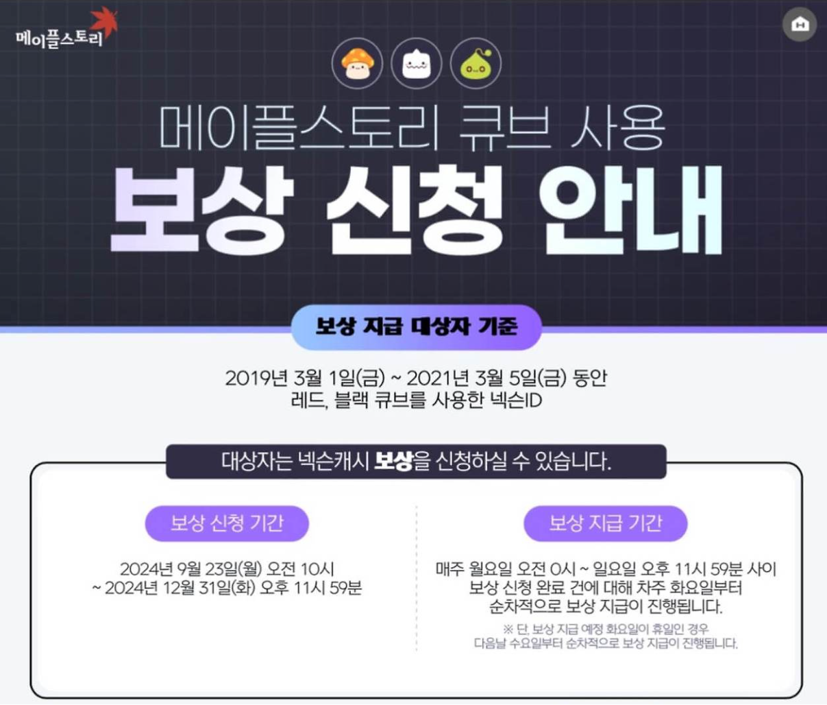 메이플스토리 큐브 보상 신청 방법 및 주요 일정