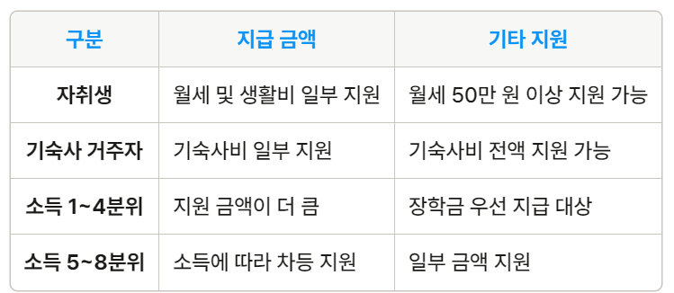 2025년 주거안정장학금 지급 금액: 소득 분위와 주거 형태에 따른 차등 지원