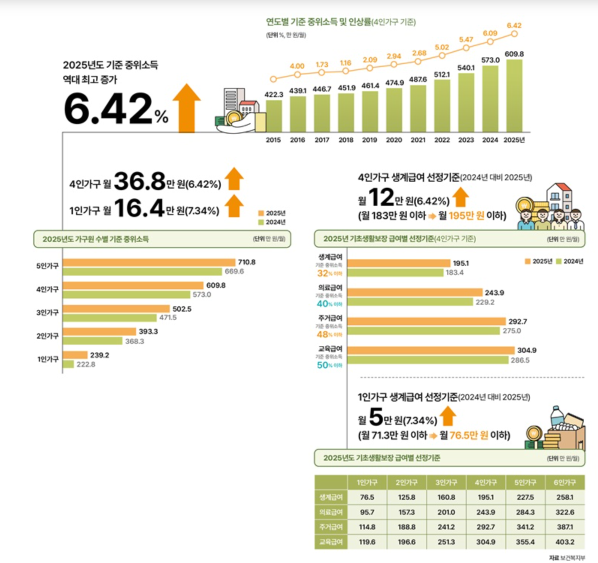 - 4인 가구 중위소득: 2024년 572만 9,913원 → 2025년 609만 7,773원 (6.42% 인상)