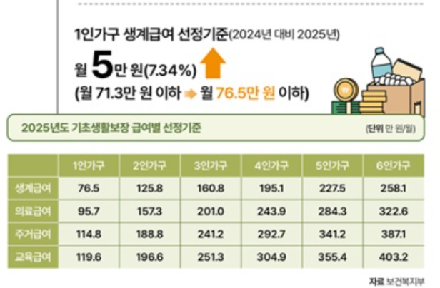 - 1인 가구 생계급여: 2024년 71만 3,102원 → 2025년 76만 5,444원 (7.34% 인상)
