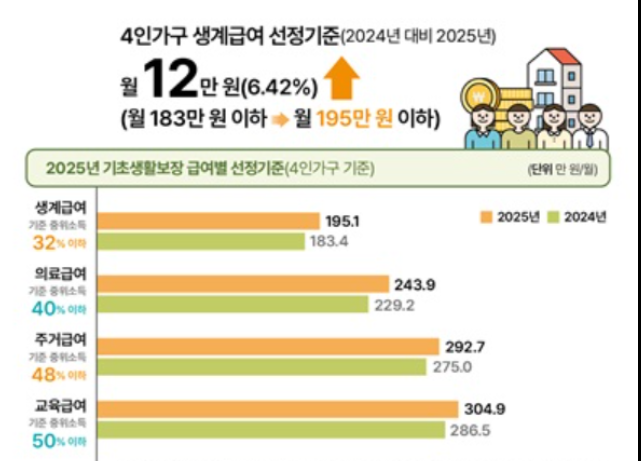 - 4인 가구 생계급여: 2024년 183만 3,572원 → 2025년 195만 1,287원 (6.42% 인상)
