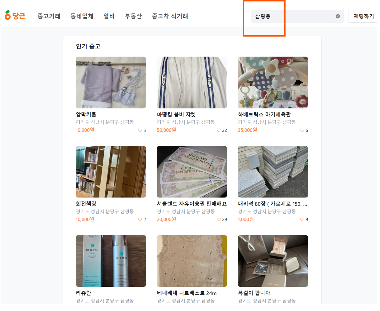 이제 제가 사는 삼평을 검색해 보겠습니다. 검색 버튼이 따로 없으므로, 삼평동을 입력한 후 Enter 키를 눌러주세요. 이렇게 간단하게 원하는 동네의 중고 매물을 찾아보실 수 있습니다. 중고 거래뿐만 아니라 업체 검색, 알바, 부동산, 그리고 당근마켓 중고차 직거래까지 다양한 기능을 활용해 보세요.