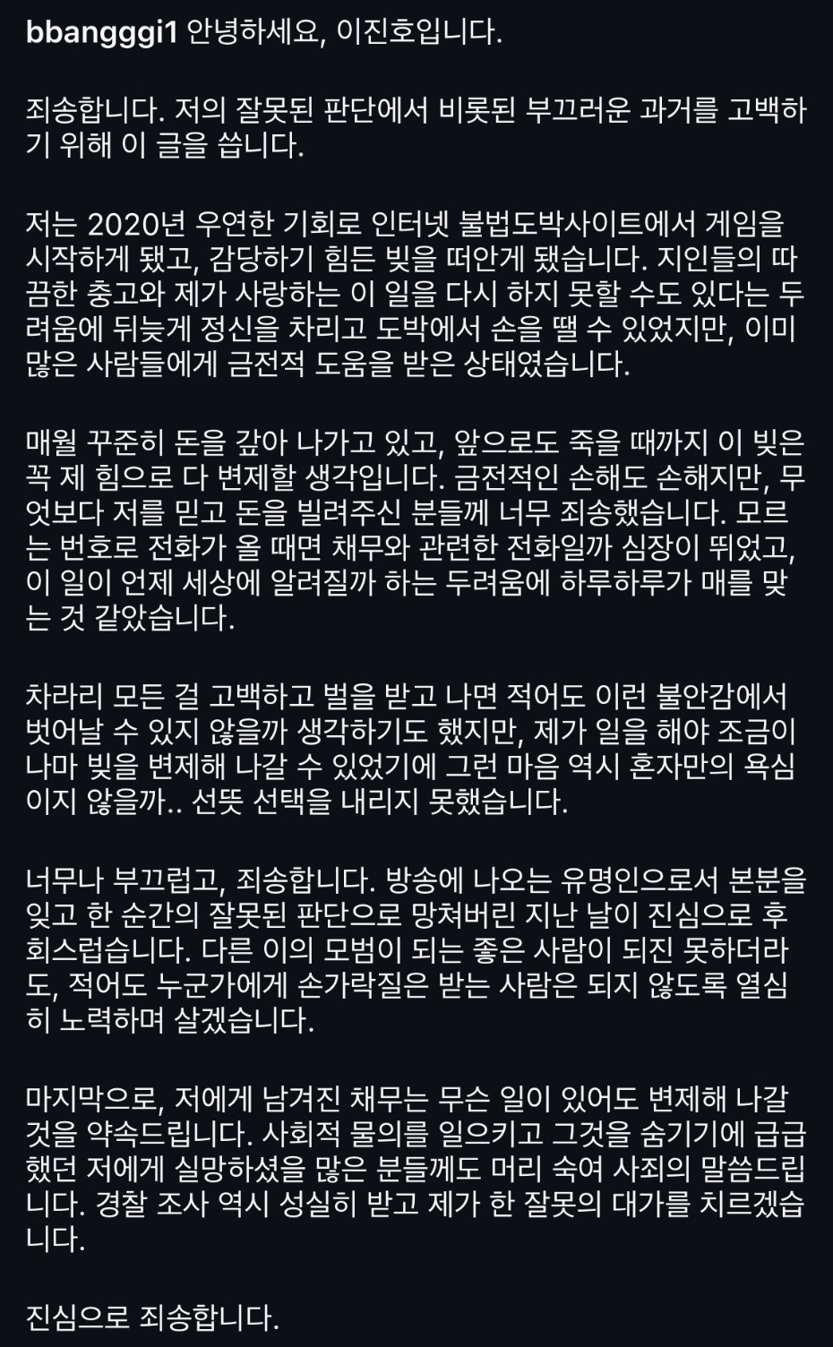이진호는 자신의 인스타그램을 통해 불법 도박에 손을 대게 된 경위와 그로 인해 발생한 빚에 대해 고백했습니다. 그는 “부끄러운 과거를 고백하기 위해 이 글을 씁니다”라며 시작했으며, 2020년부터 시작된 도박으로 인해 많은 금전적 어려움을 겪었다고 밝혔습니다. 이 과정에서 지인들에게 도움을 받았지만, 그에 대한 죄책감으로 힘든 시간을 보냈다고 전했습니다.