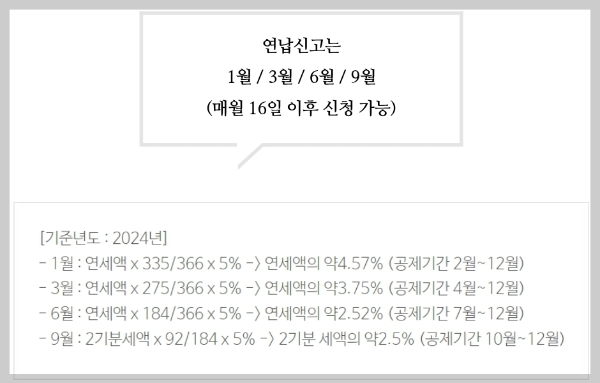 - 1월 연납신청: 최대 4.57%의 세금 공제를 받을 수 있는 가장 유리한 시기입니다.