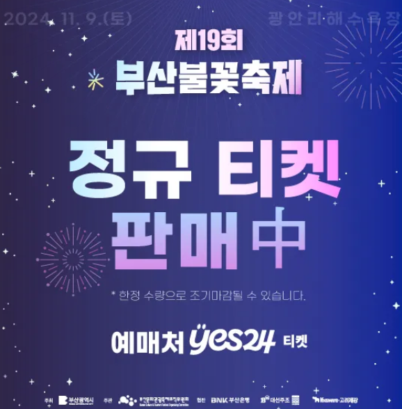부산 불꽃축제의 티켓은 예스24에서 예매할 수 있습니다. 한정 수량으로 제공되며, 1차 예매에서는 S석을 56,000원에 구매할 수 있습니다. 예매 후, 행사 당일에는 예매한 티켓을 현장에서 교환할 수 있습니다. 좌석은 R석(바다 근처)와 S석(호텔 쪽)으로 나뉘며, 공연 당일 오후 5시까지 예매가 가능합니다.