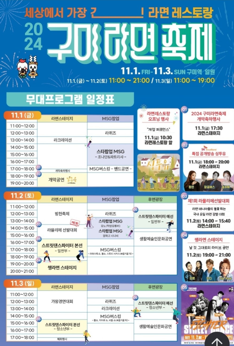 11월의 첫 주말, 구미라면축제에서 가족, 친구들과 함께 특별한 라면 여행을 떠나보세요. 라면의 매력 속으로 빠져드는 멋진 시간이 여러분을 기다리고 있습니다!