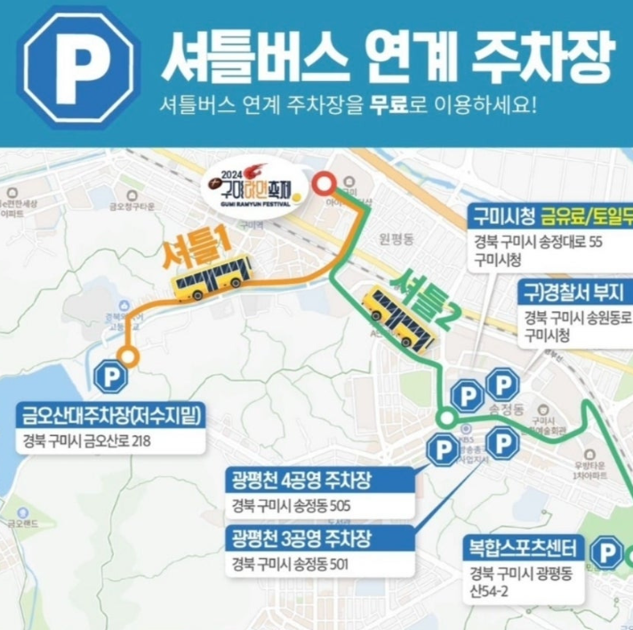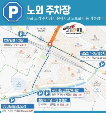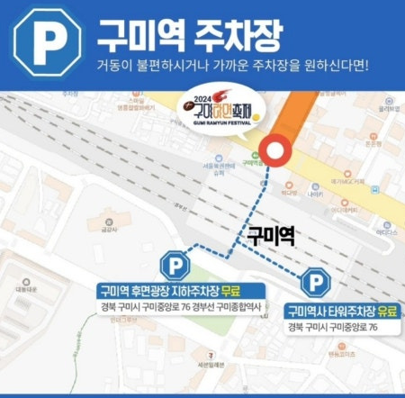 구미라면축제는 구미역 일대에서 열리므로 대중교통을 이용하거나 구미역 주차장을 활용하면 좋습니다. 그러나 많은 방문객으로 인해 주차 공간이 부족할 수 있으니, 축제에서는 셔틀버스 서비스를 운영해 편의를 도모하고 있습니다.
