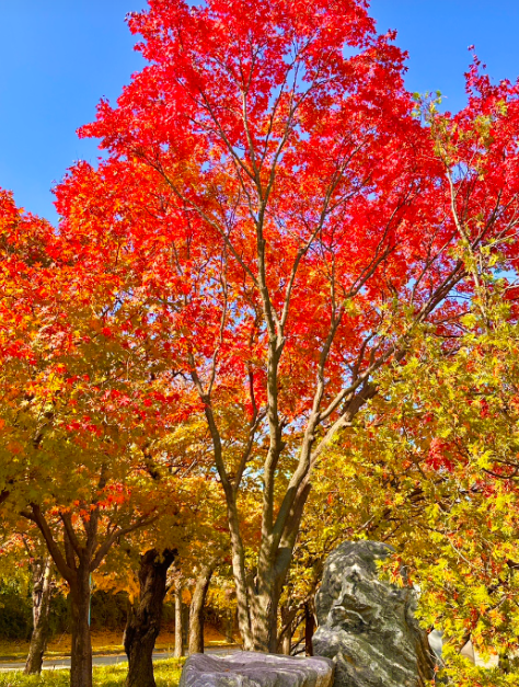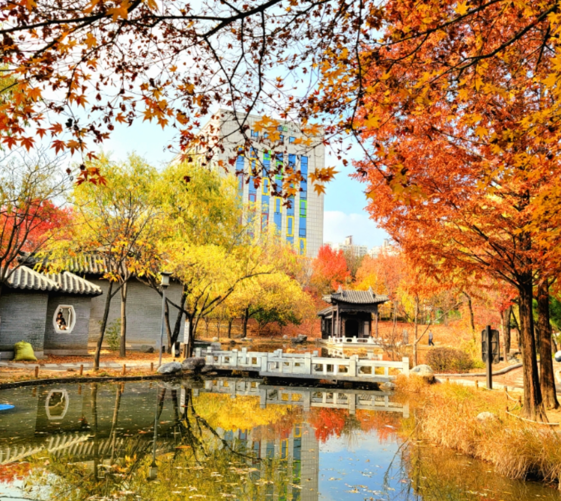 수원 효원공원의 월화원은 중국 전통 스타일의 정원으로 조성되어 있습니다. 아담한 연못과 아름다운 석조 건축물이 어우러져 독특한 분위기를 자아냅니다. 특히 가을에는 붉게 물든 단풍나무들이 정교한 석조 건물과 조화를 이루며 오묘한 풍경을 만들어냅니다. 이국적인 가을의 색감을 즐기며 특별한 추억을 남길 수 있는 장소입니다.