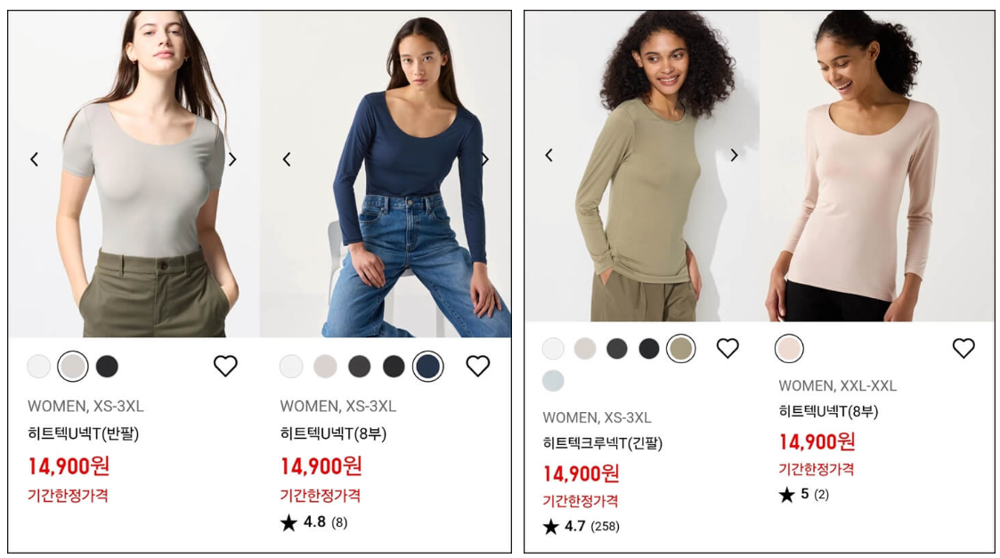 히트텍은 유니클로의 대표적인 제품으로, 이번 세일 기간 동안 다양한 스타일의 히트텍을 할인된 가격에 만나볼 수 있습니다. 터틀넥, 크루넥, U넥 등 다양한 디자인의 히트텍이 준비되어 있어, 쌀쌀한 날씨에 내의로 입기 좋습니다. 특히 히트텍은 체온을 유지해 주는 기능성 제품으로, 겨울철 필수 아이템으로 자리 잡고 있습니다. 이번 기회를 통해 여러 가지 스타일을 구매해 보세요.