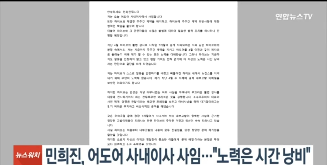 - 하이브와의 갈등: 민희진은 하이브가 자신의 경영권을 침해하고 있다고 주장하며, 이에 대한 반발로 사임을 결정했습니다. 그녀는 하이브가 잘못을 인정하지 않고 변화할 기미가 없다고 판단하여 더 이상의 노력이 시간 낭비라고 느꼈습니다