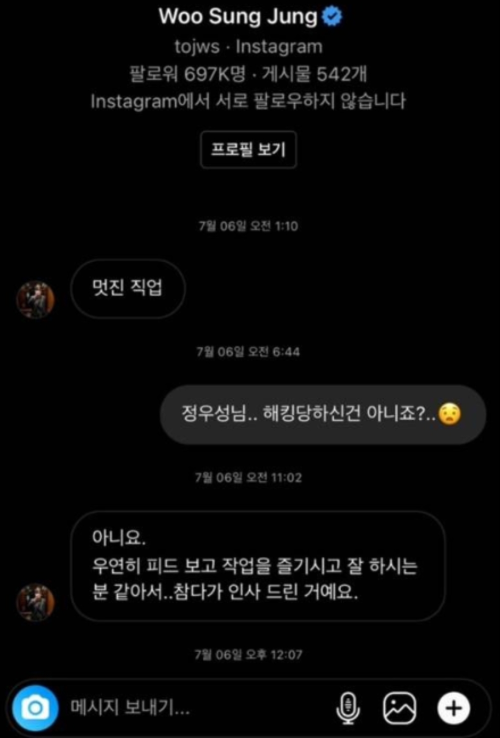정우성의 사생활이 더욱 주목받게 된 이유 중 하나는, 그의 SNS 다이렉트 메시지(DM) 내용이 유출되었기 때문입니다. 정우성이 한 일반인 여성에게 “멋진 직업”이라는 메시지를 보내며 친근하게 접근한 내용이 공개되었습니다.