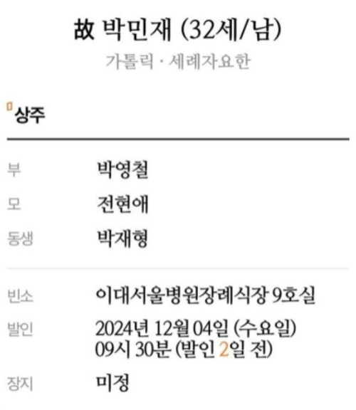 박민재의 빈소는 이대서울병원 장례식장 9호실에 마련되었으며, 발인은 12월 4일 오전 9시 30분에 진행될 예정입니다. 장지는 아직 정해지지 않았지만, 그의 마지막 길은 가족과 지인들의 슬픔 속에서 조용히 치러질 예정입니다. 많은 팬들과 업계 관계자들이 그의 마지막 길에 함께하며 애도의 뜻을 전하고 있습니다.
