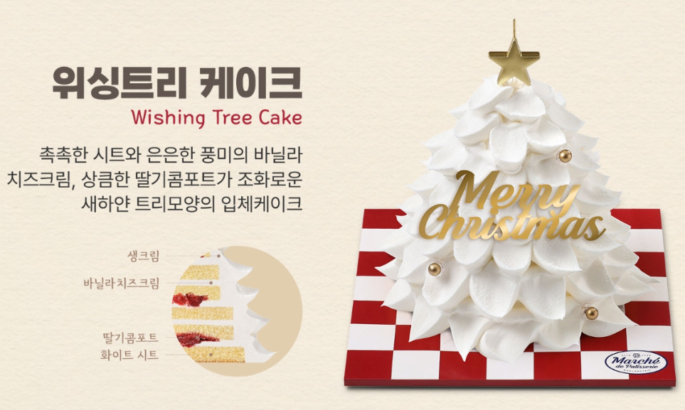 • 특징: 트리 모양으로 제작된 바닐라 치즈크림 케이크로, 화이트 크리스마스를 연상케 합니다.