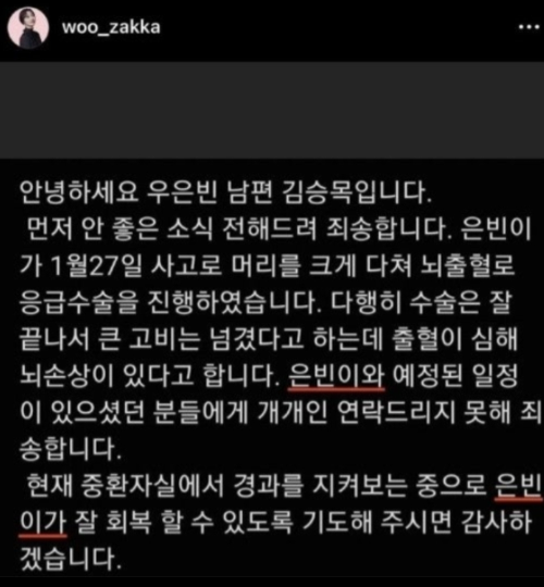 2024년 1월, 우자까 님은 강연을 위해 이동하던 중 예기치 못한 사고를 겪었습니다. 사고로 인해 뇌출혈과 뇌부종이라는 심각한 부상을 입었으며, 좌뇌의 약 5분의 2를 절제하는 대수술이 필요했습니다. 의료진은 그녀의 상태를 극도로 심각하게 평가했고, 생명과 직결되는 위기의 순간이었습니다. 하지만 그녀는 이러한 고통 속에서도 결코 희망을 잃지 않았고, 적극적으로 재활 치료를 시작했습니다.