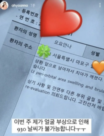 오요안나는 2024년 9월 9일 인스타그램 스토리를 통해 "이번 주 제가 얼굴 부상으로 인해 '930 MBC 뉴스' 날씨가 불가능합니다"라는 소식을 전했습니다. 그녀는 넘어져서 치아가 깨지고 안면부에 골절이 발생했다는 진단서를 공개하며 팬들을 걱정하게 했습니다. 이러한 상황 속에서도 그녀는 동료들에게 감사의 마음을 전하며 긍정적인 모습을 잃지 않았습니다.