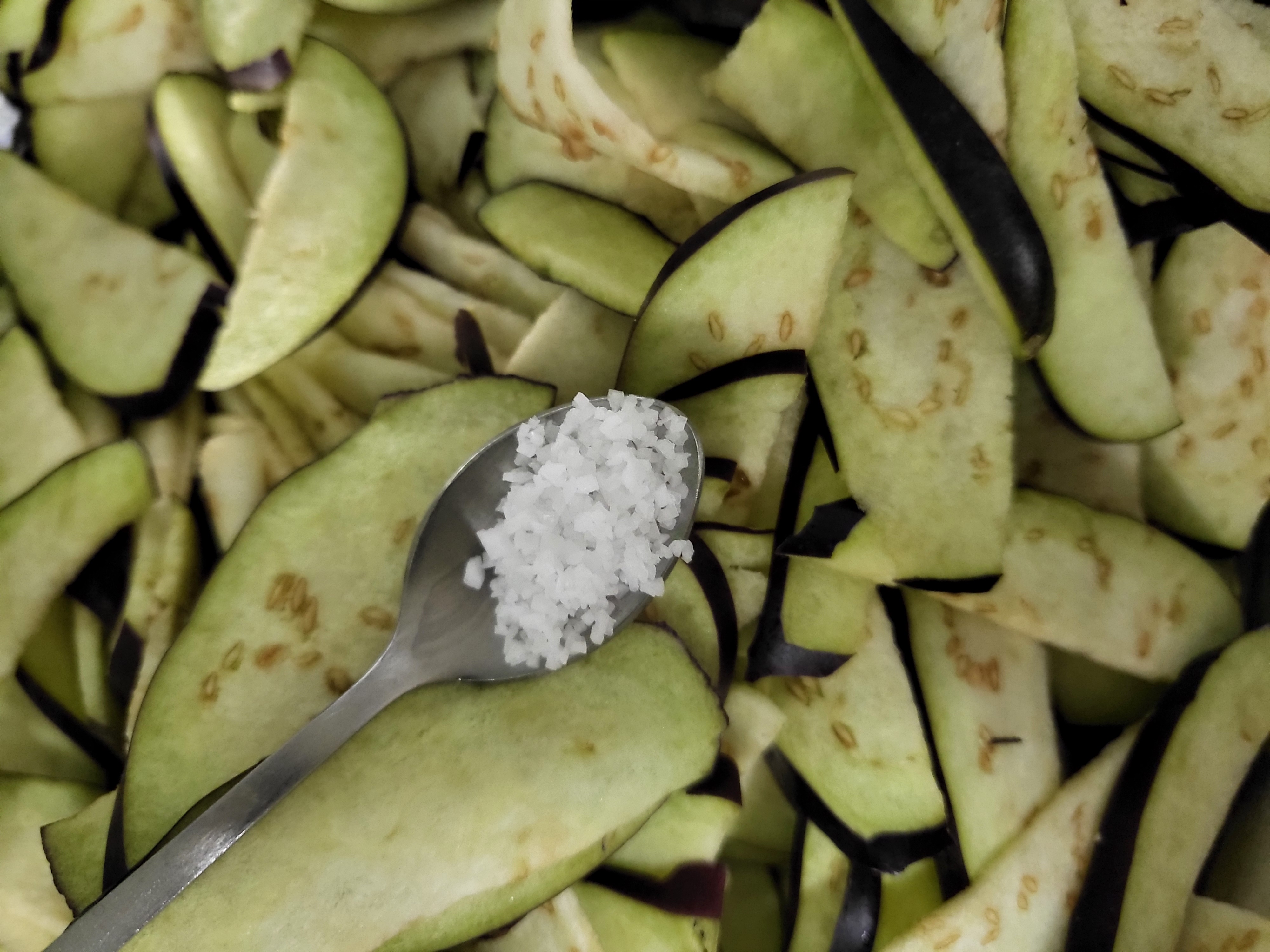 썬 가지에 소금을 뿌려 살짝 절인 후, 삼베찜보로 비틀어 수분을 꼭 짜냅니다.