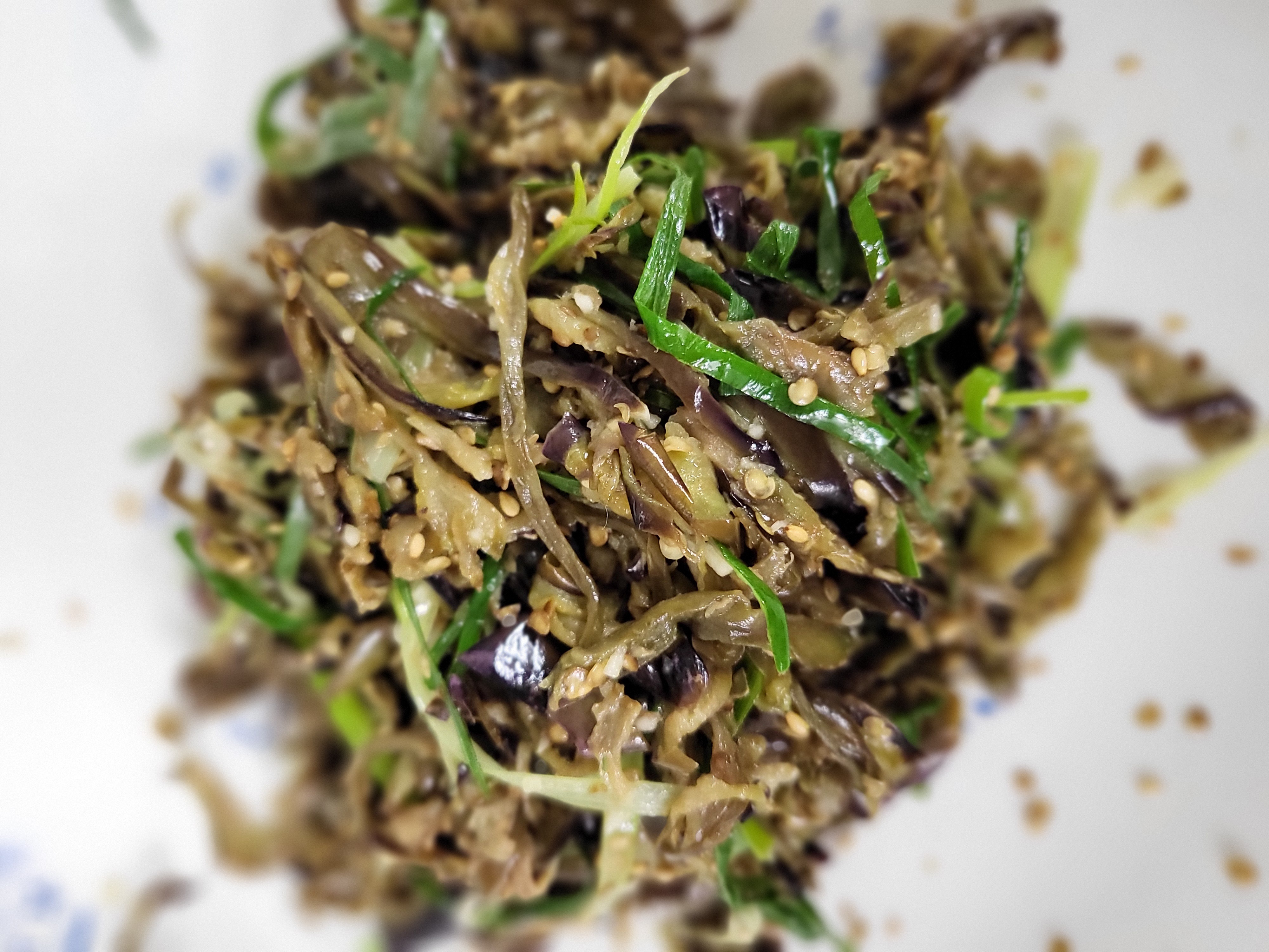 달군 팬에 기름을 조금 두르고, 절인 가지를 볶아 넓은 접시에 재빨리 식힙니다.