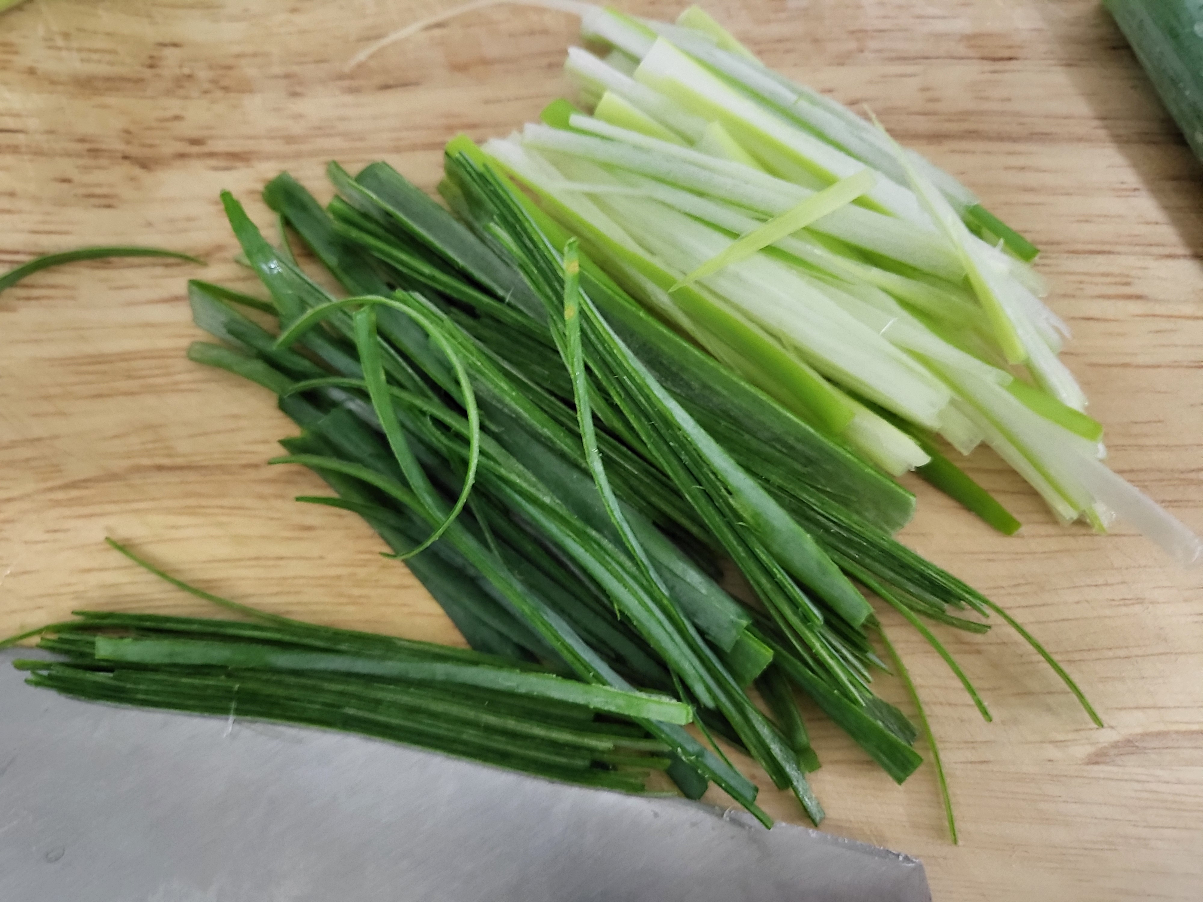 ✔️홍고추는 반으로 갈라 곱게 채 썰고, 실파는 3센티 길이로 썰어 준비합니다.