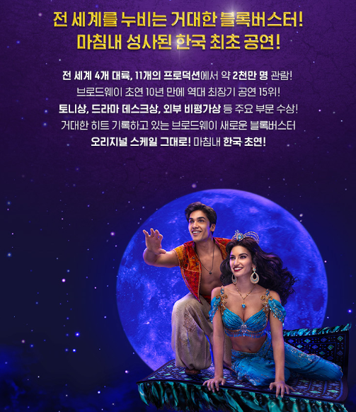 이번 뮤지컬은 브로드웨이에서 시작해 세계적으로 큰 사랑을 받은 작품이에요. 특히 마법의 양탄자를 타고 하늘을 나는 장면은 공연의 하이라이트라 할 수 있어요. 이 장면은 실제로 무대에서 구현될 예정이니 기대해도 좋을 것 같아요!