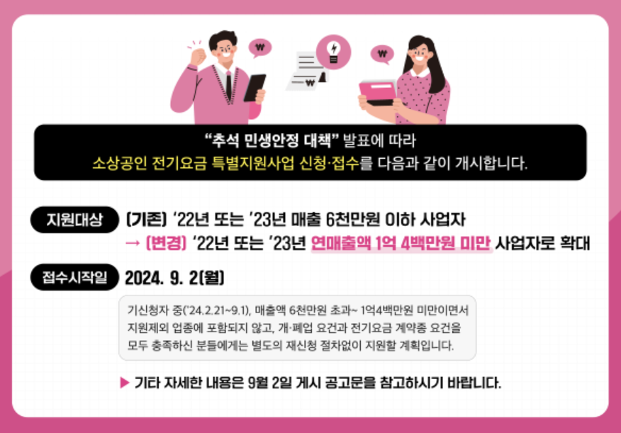 이번 지원은 9월 2일부터 신청이 가능하고, 매출 기준도 기존 6,000만 원에서 1억 4백만 원 미만으로 상향 조정돼서 더 많은 분들이 혜택을 받으실 수 있게 됐어요! 간단한 절차만 거치면 전기요금 부담을 확 줄일 수 있는 좋은 기회니까! 꼭! 소진전에 신청하셔서 혜택을 받아보세요!