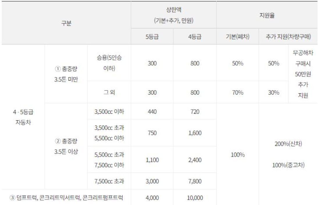 자세한 지원금 기준은 한국자동차환경협회 홈페이지를 통해 확인할 수 있습니다. 지원 금액은 차량 상태와 정부의 기준에 따라 달라지므로 신청 전에 정확한 금액을 미리 확인하는 것이 좋습니다.