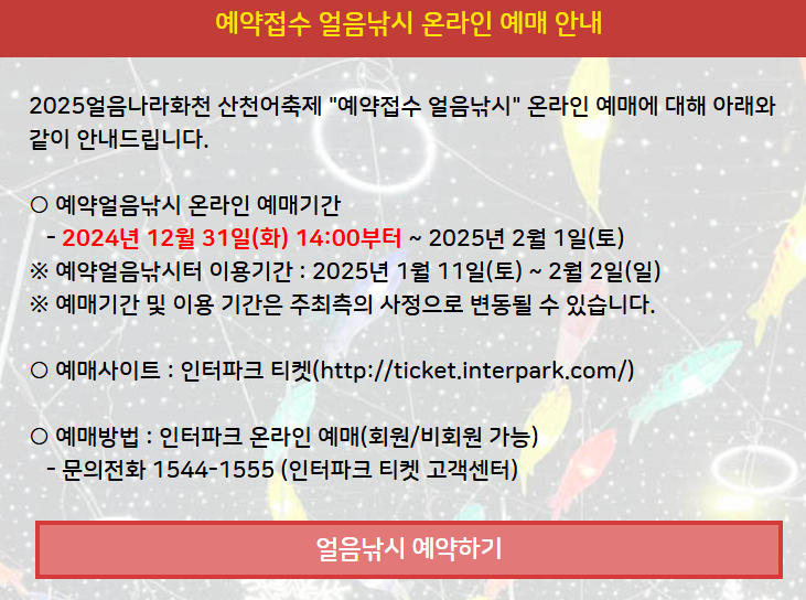 화천 산천어축제의 하이라이트는 단연 얼음낚시입니다. 성공적으로 참여하려면 사전 예약이 필수인데요.