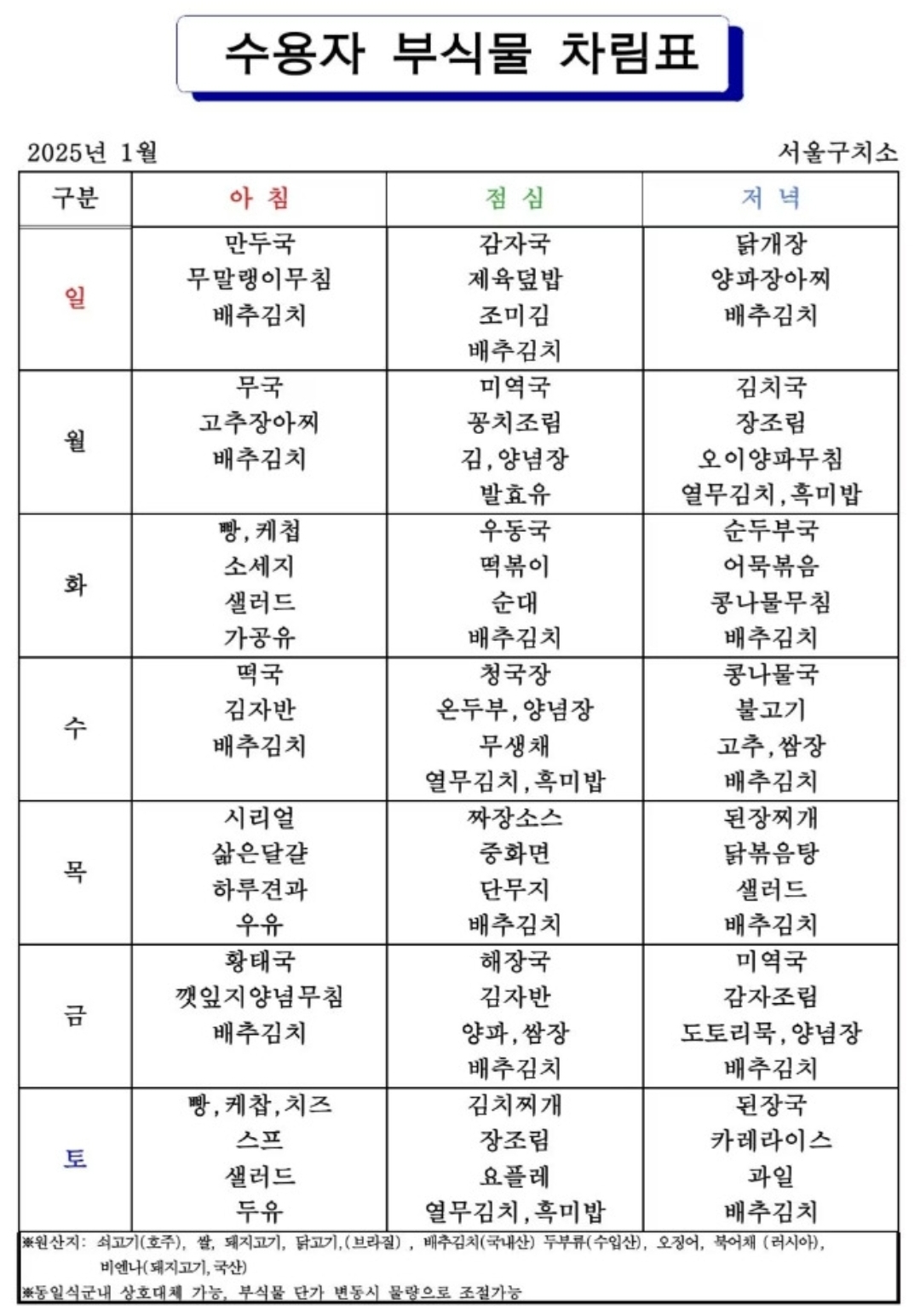 서울구치소는 수감자의 건강과 영양을 고려한 식단을 제공합니다. 전문 영양사가 설계한 식단은 한 끼당 약 1,700원 예산으로 구성되며, 일반 식단과 동일한 메뉴를 제공합니다.