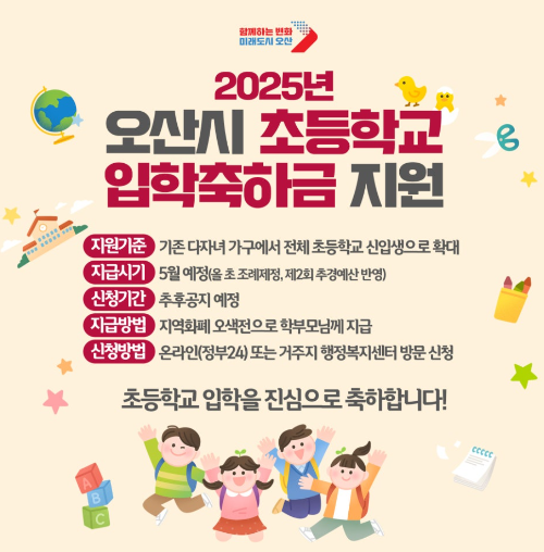 오산시, 2025년 초등학교 신입생 입학축하금 지원 소식!