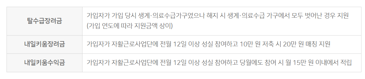 내일키움장려금: 자활근로사업단에 12일 이상 참여하고 10만 원 저축 시 20만 원 지원