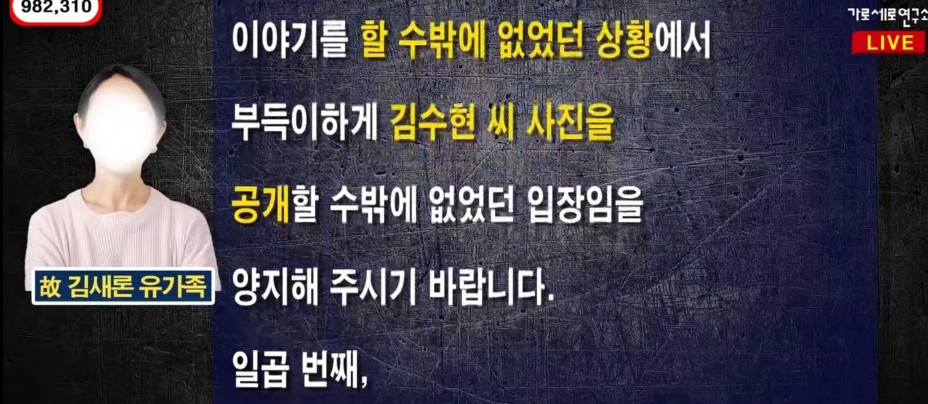 또한 어머니는 김수현과의 관계를 공개적으로 밝힌 이유에 대해서도 설명했습니다. 그녀는 유튜버 이진호와 관련된 허위 사실이 퍼지면서, 김수현과의 관계를 이야기할 수밖에 없었다고 밝혔습니다. 유족 측은 가짜 영상과 관련된 진실을 밝히기 위해 이러한 결정을 내렸다고 주장하며, 이진호에 대한 고발을 접수할 예정이라고 전했습니다. 어머니는 이와 관련해 진심 어린 공개적인 사과를 바란다고 덧붙였습니다.
