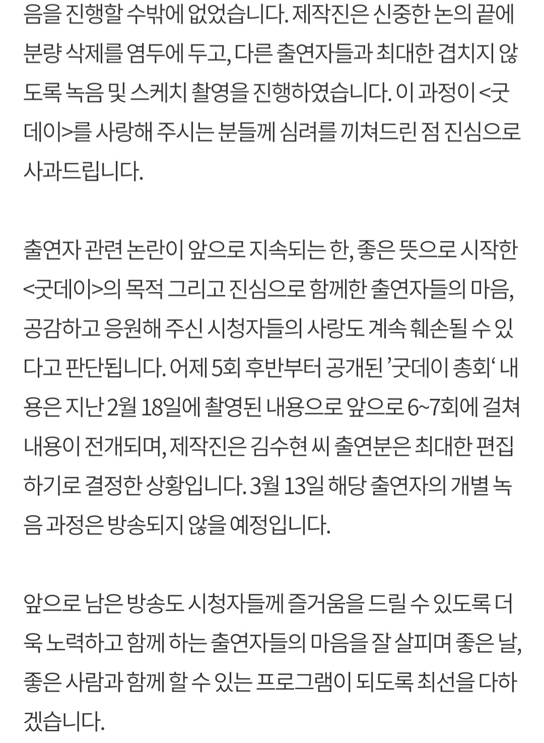 - 녹음 내용 제외: 3월 13일에 녹음된 김수현의 개별 녹음 내용은 방송되지 않기로 결정되었습니다.