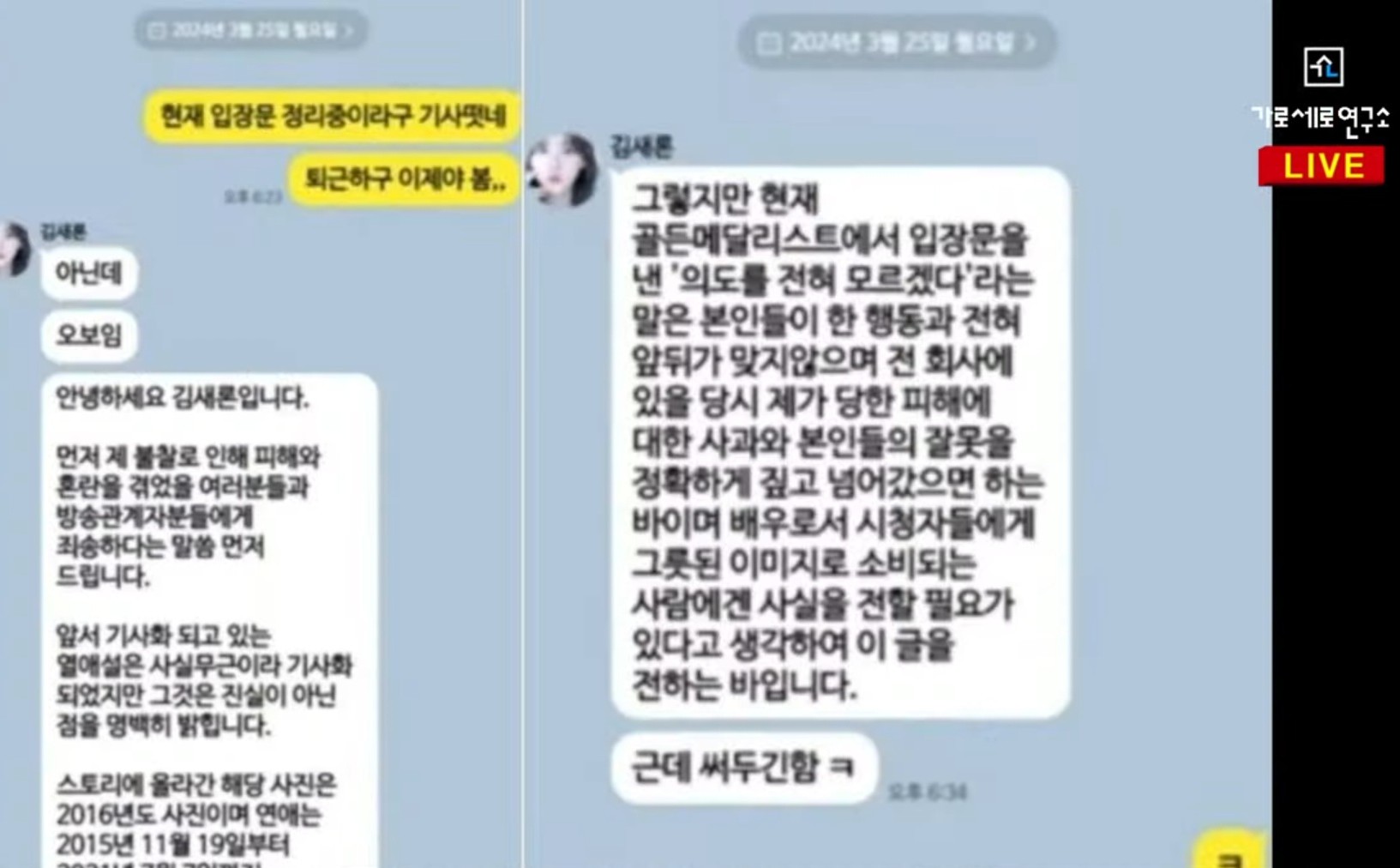 최근 (어제) "가세연" 김수현에 대한 폭로가 이어지고 있습니다. 김수현의 얼굴이 담긴 동영상을 공개하겠다고 경고하며, 그의 목소리가 담긴 방송을 진행했습니다. 이에 대해 많은 팬들과 네티즌들이 큰 관심을 보이고 있습니다.
