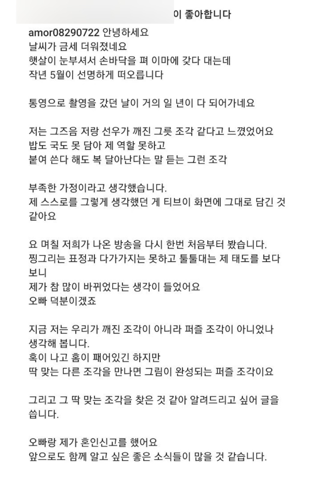 옥순은 지난 5월 13일, 자신의 SNS를 통해 직접 혼인신고 소식을 알렸습니다. 그녀의 글에는 솔로 나라 출연 당시 느꼈던 솔직한 심정이 담겨 있었는데요. 자신과 아들 선우가 마치 '깨진 그릇 조각'처럼 부족한 가정이라고 생각했었다고 고백했습니다. 하지만 나는솔로 출연 후 경수를 만나면서 스스로와 삶에 대한 생각이 많이 바뀌었다고 해요. 깨진 조각이 아니라 '퍼즐 조각'이 아니었을까 생각하게 되었고, 이제 자신에게 딱 맞는 다른 조각인 경수를 만났다며 혼인신고 소식을 전해 많은 이들에게 깊은 감동을 안겼습니다.