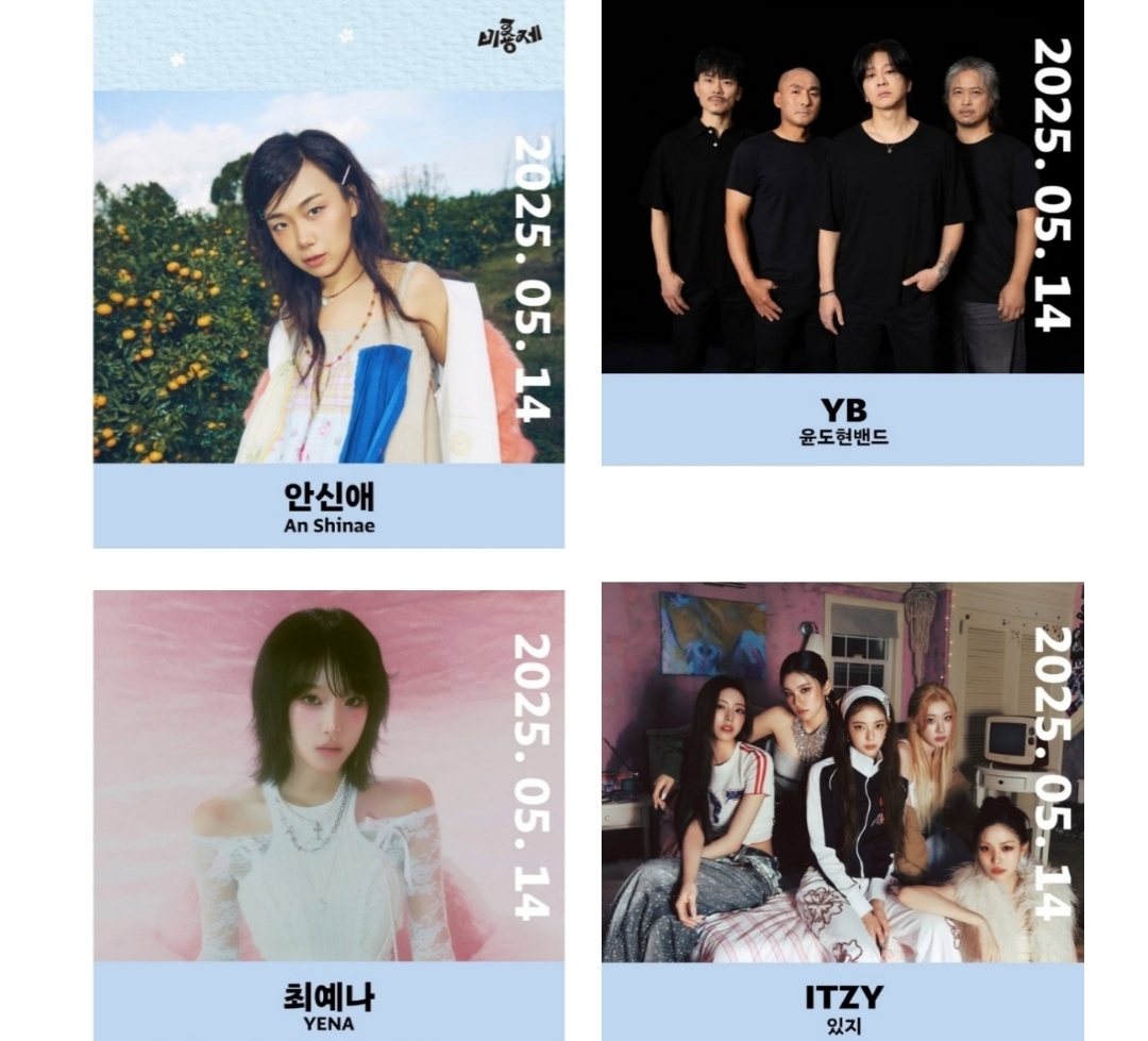 -   1일차 (5월 14일, 수요일): 축제의 첫날을 열어줄 아티스트들은 바로 안신애, 최예나, YB (윤도현 밴드), ITZY입니다! 섬세한 감성의 발라드와 팝을 넘나드는 안신애, 아이즈원 출신 솔로 아티스트 최예나의 다채로운 무대, 한국 록 음악의 상징 YB의 강렬한 라이브, 그리고 파워풀한 퍼포먼스의 글로벌 대세 걸그룹 ITZY까지! 첫날부터 분위기가 정말 뜨거울 것 같네요! 중독성 강한 히트곡들을 현장에서 직접 느껴보세요!