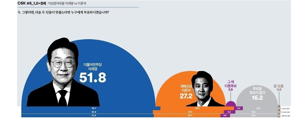 더불어민주당 이재명 후보와 국민의힘 김문수 후보 간 양자 가상대결에서도 이재명 후보가 52.6%를 기록해 김문수 후보(35.5%)보다 17.1%포인트 앞서는 결과가 나왔습니다. 이재명 후보와 개혁신당 이준석 후보를 비교했을 때도 이재명 후보가 51.2%로 이준석 후보(25.7%)를 압도했습니다. 이재명 후보는 30대 이상 전 연령대, 모든 지역에서 고르게 우위를 점하고 있었으며, 이준석 후보는 20~30대 남성층에서만 상대적으로 높은 수치를 보였습니다.