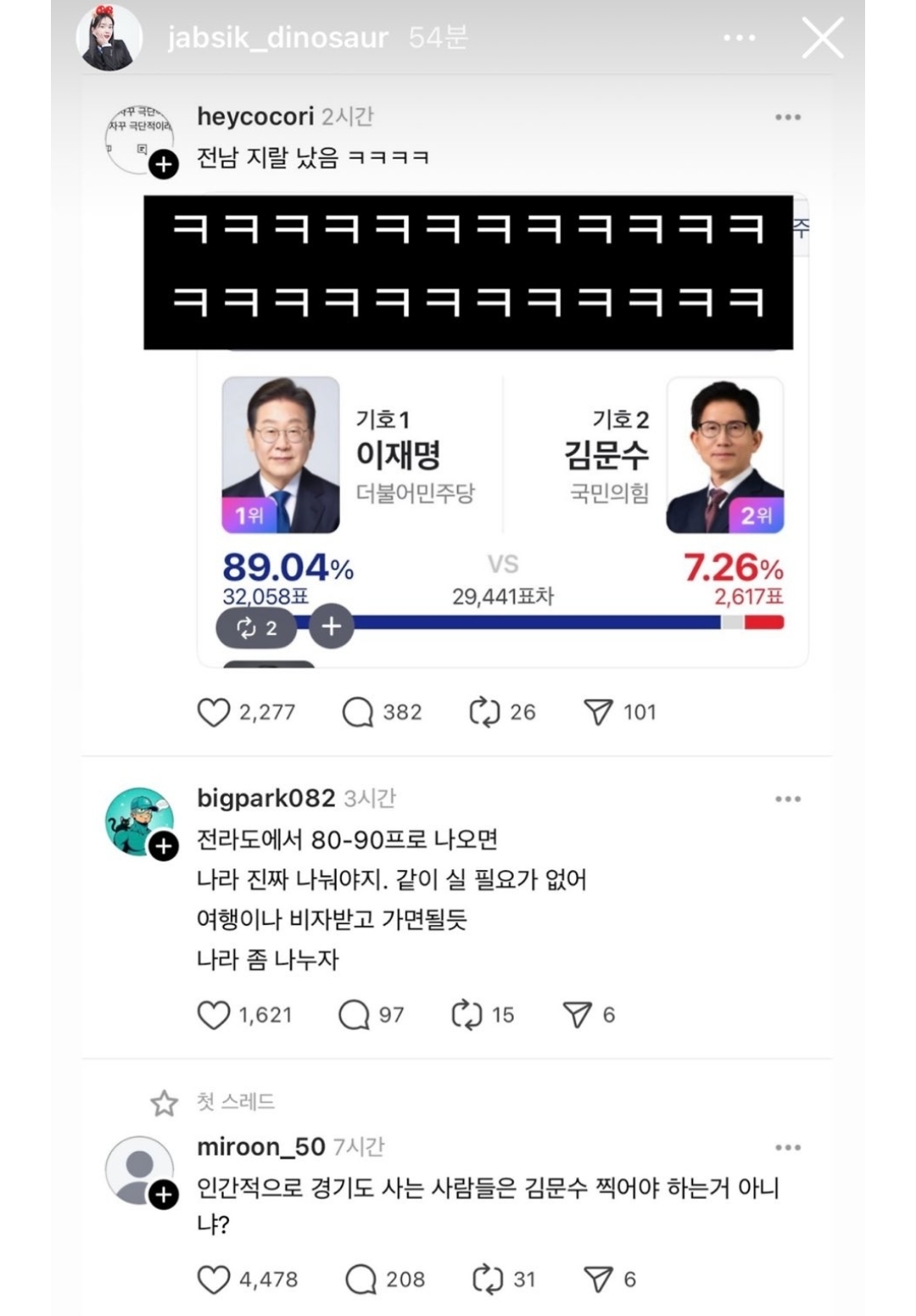 문제는 2025년 6월 5일, 유튜버 '잡식공룡' 왕현수 씨가 자신의 SNS에 올린 단 하나의 게시물에서 시작되었습니다. 그녀는 제21대 대통령 선거 당시 전라남도 지역의 압도적으로 높은 득표율을 언급하며, 해당 지역 유권자들을 조롱하는 듯한 문장을 남긴 것인데요.