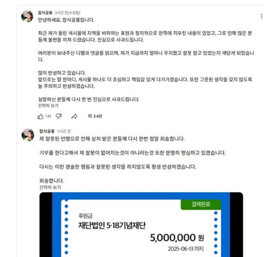 논란이 커진 지 하루 만인 6월 6일, 왕현수 씨는 유튜브 채널 커뮤니티에 공식 사과문을 올렸습니다. "최근 제가 올린 게시물에 지역을 비하하는 표현과 정치적으로 한쪽에 치우친 내용이 있었고, 많은 분께 불편을 드려 죄송하다"고 밝히며, 자신의 인식 부족과 표현의 부주의함을 인정하는 내용이었습니다. 사과와 함께 5·18 기념 재단에 500만 원을 기부한 사실도 공개하며 진심을 보이고자 했지만, 대중의 반응은 엇갈렸습니다. "기부는 좋은 일이지만 사과문은 너무 늦었다", "사과 이전에 항의하는 사람들에게 도발적인 답글을 남겼던 행동을 먼저 반성해야 한다"는 비판이 여전히 존재했습니다.