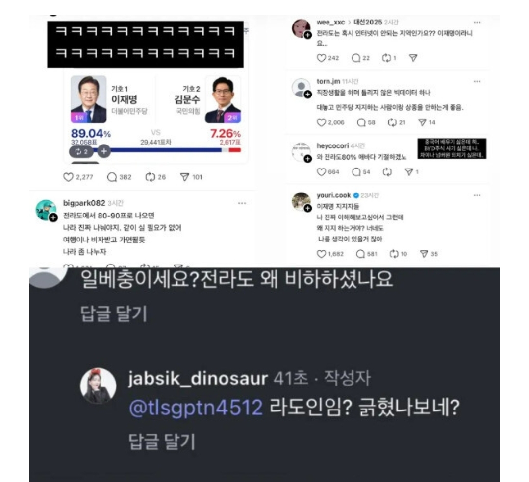 그는 "전남 ㅈ랄 났다"라는 다소 거친 표현과 함께 "80~90% 나오면 나라 나눠야지. 비자 받고 여행이나 가자"는 등 과도하고 자극적인 문구를 사용했습니다. 더 큰 문제는, 해당 게시글에 불쾌함을 느낀 누리꾼이 항의 댓글을 달자 "(전)라도인임? 긁혔나 보네"라는 답글을 남기며 논란을 더욱 키웠다는 점입니다. 해당 표현은 단순한 말장난을 넘어, 특정 지역과 그 지역 유권자들을 조롱하고 외국인 취급하는 느낌으로 받아들여졌고, 순식간에 인터넷을 통해 퍼지기 시작했습니다.