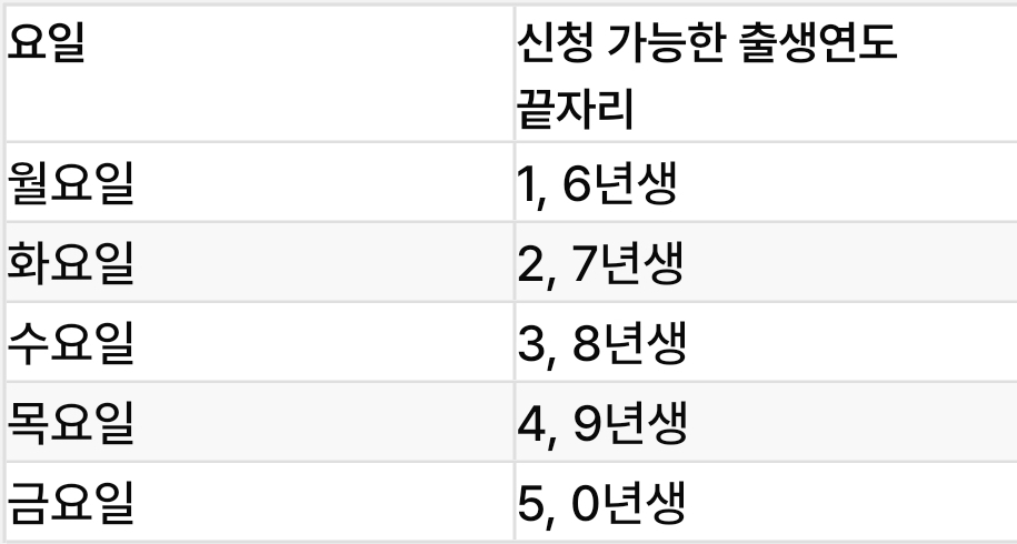 신청 첫 주인 7월 21일부터 7월 25일까지는 출생연도 끝자리에 따른 요일제가 적용됩니다. 이는 신청 과부하를 방지하기 위한 조치입니다. 주말에도 요일제가 적용되므로 온라인 신청 시 유의해야 합니다. 7월 28일 이후부터는 출생연도에 관계없이 누구나 자유롭게 신청할 수 있습니다.
