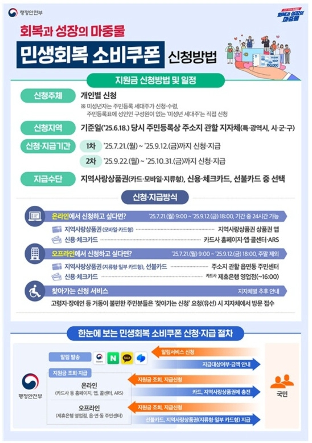 거동이 불편한 고령자와 장애인을 위해서는 찾아가는 신청 서비스도 운영되며, 6월 18일 기준 국외 체류 중이었던 국민이 9월 12일까지 귀국한 경우 이의신청을 통해 지원금을 받을 수 있습니다. 지급 방식은 신용카드, 체크카드, 선불카드, 지역사랑상품권 중 선택할 수 있습니다.