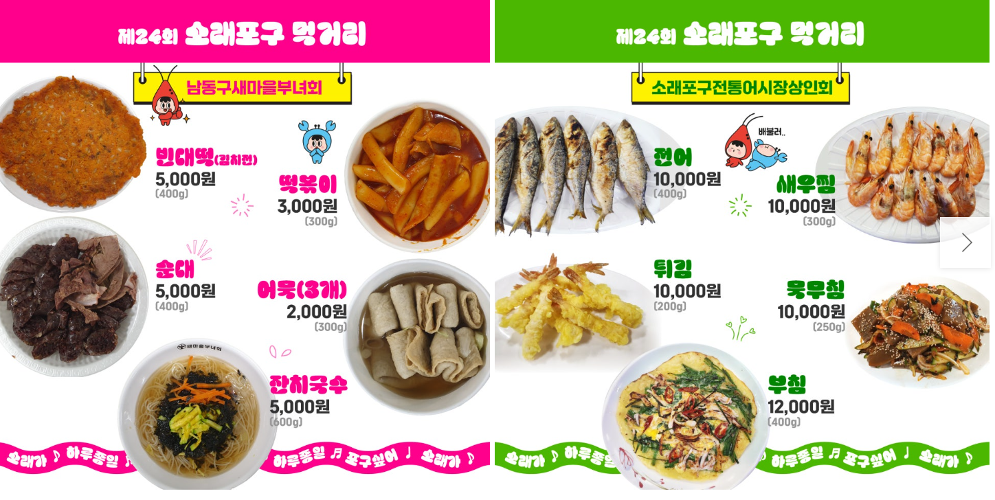 - 소래 어촌계 부녀회: 꽃게무침(15,000원), 대하찜(10,000원), 전어구이(15,000원), 미니족발(10,000원), 해물라면(10,000원), 간재미무침(15,000원)