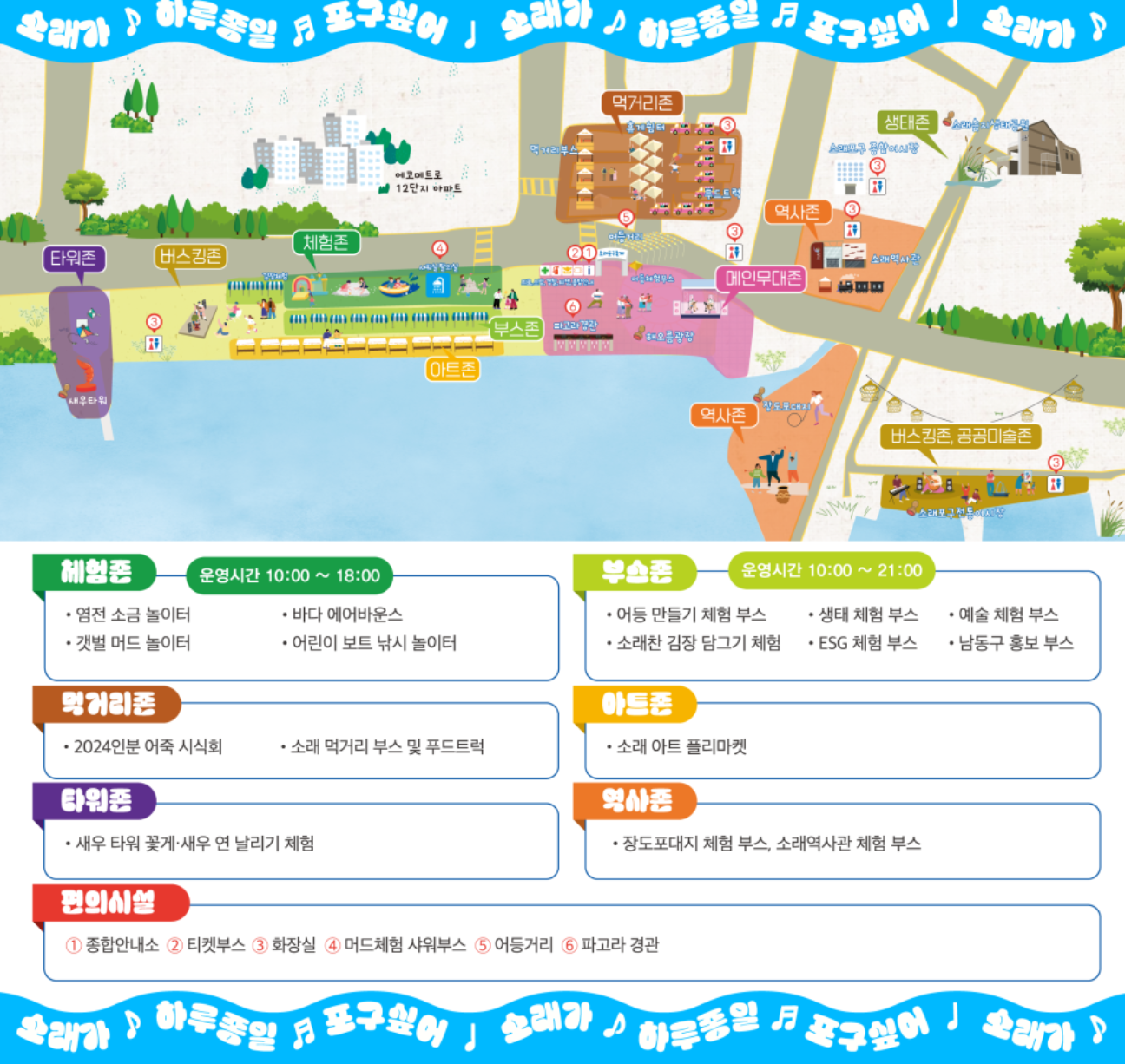 2024 소래포구 축제는 여러 구역으로 나뉘어 각기 다른 매력을 제공합니다. 체험존, 부스존, 아트존, 공공미술존, 역사존, 메인무대존 등 10개의 구역에서 다양한 프로그램이 진행됩니다. 특히, 각 구역에서는 지역의 특색을 살린 특별한 경험을 할 수 있도록 구성되어 있어, 방문객들이 다양한 볼거리를 즐길 수 있습니다.