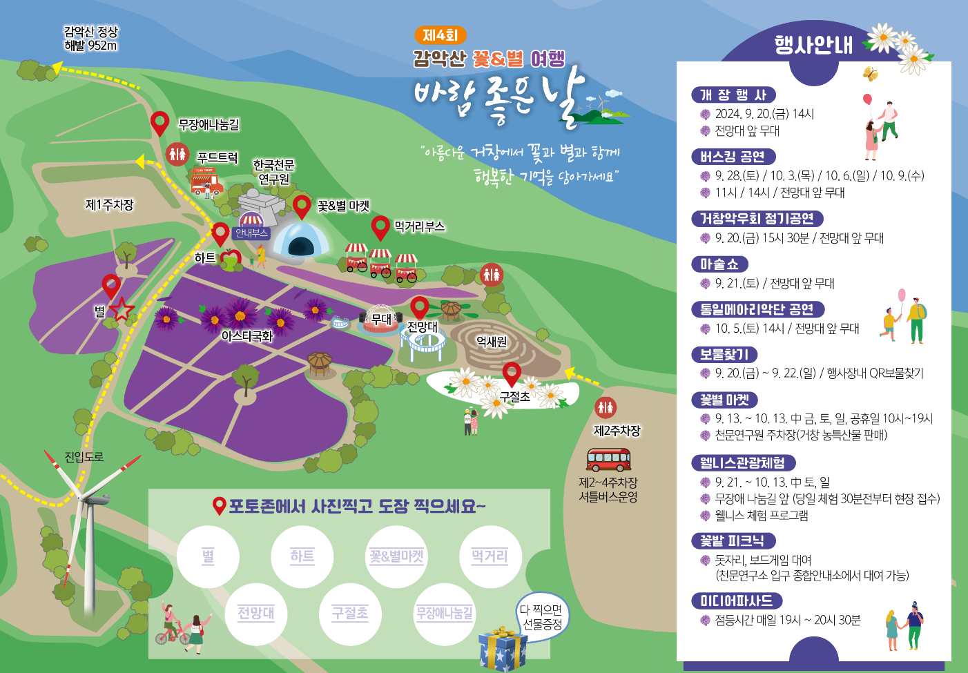 감악산 아스타국화 축제에서는 꼭 방문해야 할 포토존이 있습니다. 이 포인트들을 알고 가면 시간을 절약하면서도 멋진 사진을 남길 수 있습니다.